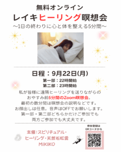 無料オンラインヒーリング瞑想会開催します ヒーリング 2025.09.182025.09.25 今度9月22(日)月曜日の新月の日に ズームにてヒーリング瞑想会を開催します 詳しくはこちら☆ 日頃の疲れを癒やしませんか?